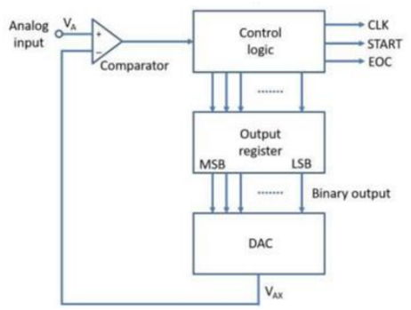 - At this point, all of the register bits have been processed, the conversion is complete and the control logic activates its EOC output to signal that the digital equivalent of is now in the output register.