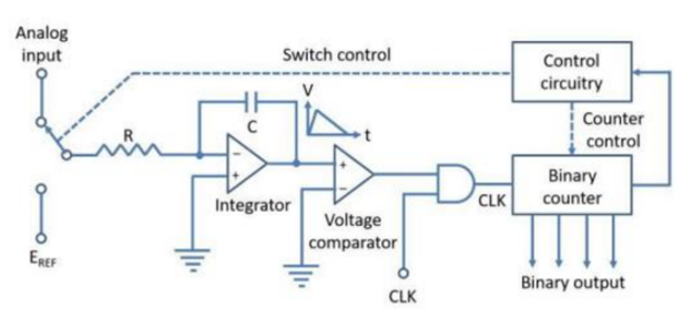 - Figure shows the functional block diagram of a dual-slope ADC.