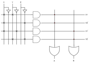 - EXAMPLE : Implement the following Boolean functions using PAL. A=XY+XZ′ B=XY′+YZ′
