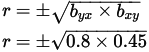 r = (n * Σ(xy) – Σ(x) * Σ(y)) / sqrt((n * Σ(x^2) – (Σ(x))^2) * (n * Σ(y^2) – (Σ(y))^2))